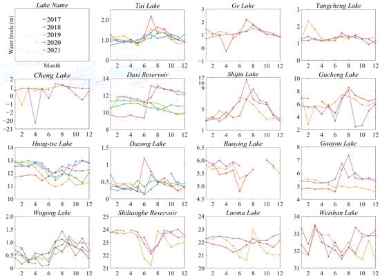 The flood season in Jiangsu Province typically spans from 1 May to 30 September each year, with June to July considered the plum rain season. During this period, there is usually higher precipitation, leading to significant changes in lake water levels. Most lakes in Jiangsu Province exhibited seasonal changes in water level. In most cases, water level changes could be constructed accurately, especially for lakes with large areas, such as the Tai Lake, Hung-tse Lake, Gaoyou Lake, etc. (refer to Figure 7).