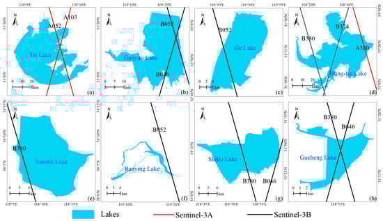 Sentinel-3A orbits and Sentinel-3B orbits crossing lakes. (a–h) illustrate the trajectories of Sentinel-3A/B over eight distinct lakes.