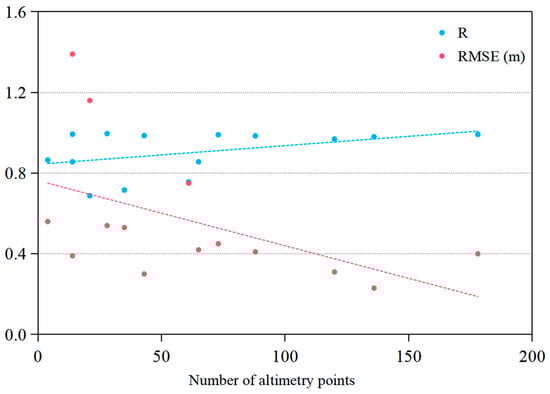 Scatter plot of R, RMSE, and the number of altimetry points. The line segments in the figure are fitted lines.