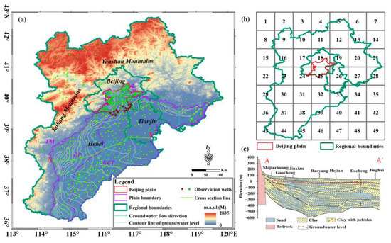 Map of the study area. (a) Location of the study area, monitoring well distribution and groundwater flow direction. (b) The numbers denote the grid numbers from the upper left to the lower right in the 1° grid. (c) Hydrogeological cross section along the A–A′ line.