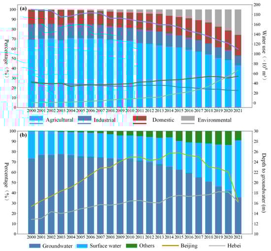 Water resource utilization and groundwater level changes. (a) Water use by different sectors and (b) water supply sources and groundwater level changes in Beijing and the Hebei Plain.