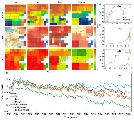 Comparison of different total water storage anomalies. (a) Represents the distribution of RMSE, NSE, and CC between different reconstructed data and the GRACE observations of TWSA. (b–d) Represent the empirical cumulative distribution functions (ECDF) of RMSE, NSE, and CC for different reconstructed data. (e) Represents the time series of different TWSA.
