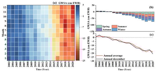 Groundwater storage anomalies in the study area from 2003 to 2020. (a–c) represents monthly, seasonal, and annual changes in groundwater storage anomalies, respectively.