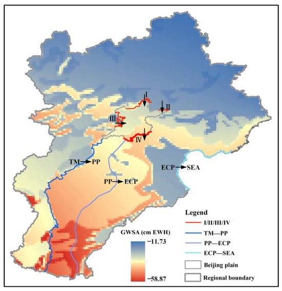 Groundwater storage anomaly in December 2020. I, II, III, and IV indicate the different boundaries (north, east, west, and south, respectively) in the Beijing Plain. The black arrows indicate the direction of groundwater exchange from the outside to the inside boundaries.