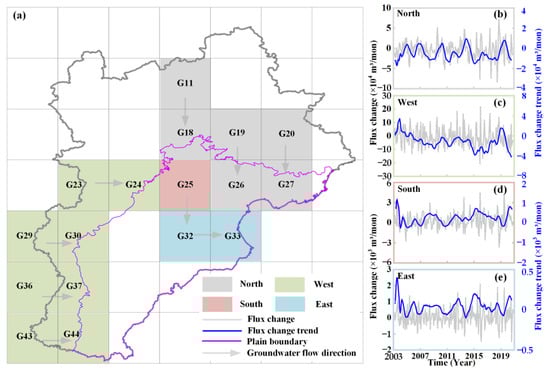 Groundwater flux exchange between different 1° grids. (a) Represents the location of groundwater flux exchange in different directions. (b–e) Represent the trends in groundwater flux exchange in the north, west, south, and east directions, respectively.