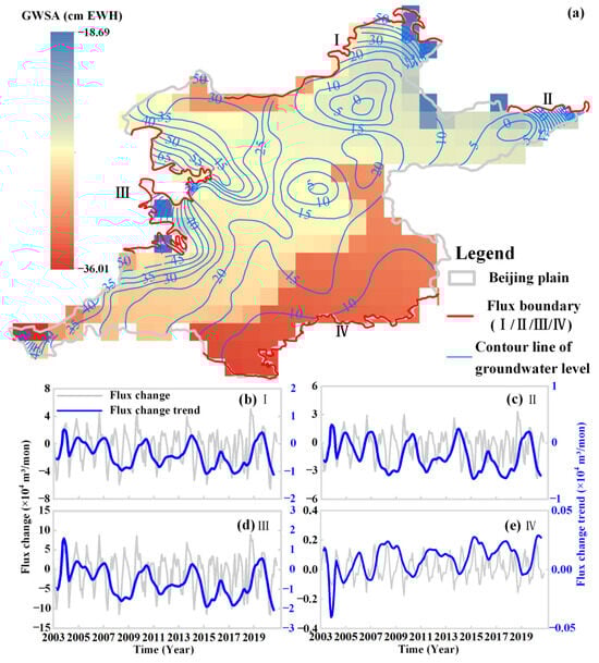 (a) The contour of groundwater and groundwater storage anomalies in the Beijing Plain for December 2020, as well as the locations of groundwater exchange along the different directions. The gray and blue lines in (b–e) indicate the average changes in groundwater exchange and groundwater exchange trend, respectively, across I, II, III, and IV boundaries.