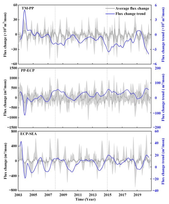 Figure 9 shows the groundwater exchange among the various hydrogeologic regions, including the Taihang Mountains to the Piedmont plains (TM-PP), the Piedmont plain to the eastern–central plain (PP-ECP), and the eastern–central plain to the coastal areas (ECP-SEA), as shown in Figure 5. The gray shadow in Figure 9 indicates the groundwater exchange between each grid cell on the boundary, the gray lines denote the average exchange quantity, and the blue line indicates the flux change trend. Notably, there were considerable variations in flow exchange among the different grid points, with the most significant fluctuations occurring within the Taihang Mountains and plains. Between 2003 and 2007, a pronounced downward trend was observed, with the most substantial decrease occurring between the Taihang Mountains and Piedmont plains, at a rate of 522 m3/month. Similarly, since 2008, the exchange of groundwater storage has shown an increasing trend. There was no significant change in groundwater exchange from the Piedmont plain to the central and eastern plains or from the central and eastern plains to coastal areas.