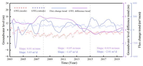 The lateral flow from the mountainous areas depends on the horizontal permeability, saturation zone thickness, and local hydraulic gradient [30]. The variation in groundwater levels serves as an indicator of groundwater circulation dynamics. Specifically, the difference in the groundwater level reflects the magnitude of the hydraulic gradient along the flow direction within a certain distance. With increasing hydraulic gradient, the rate of groundwater exchange along this direction increases. In this research, we conducted a comparative analysis between the groundwater level changes and groundwater flux exchange along the border between the Beijing Plain and the Hebei region. To achieve this goal, we selected 14 monitoring wells (the red observation wells in Figure 1a). In Figure 10, the red and blue scatter points illustrate the average fluctuations in groundwater levels within monitoring wells along the seven inner and seven outer boundaries, respectively. The data reveal that the average groundwater level at the inner boundary is consistently lower than that at the outer boundary. This observation supports the conclusion that groundwater flows from Beijing to Hebei along border IV. The magenta line illustrates the trend in the groundwater level differences between the inner and outer boundaries, calculated using the STL method, while the blue line denotes the trend in groundwater flux exchange at the IV boundary of the Beijing Plain area.