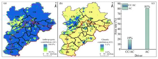 where GWSAcc, GWSAac, and GWSAor denote the monthly climate-driven GWSA, anthropogenic-driven GWSA, and original GWSA, respectively, and P and ET denote the monthly precipitation and evapotranspiration anomalies, respectively. The coefficients a and b are regression coefficients estimated through a linear fitting at the grid scale, which were combined with the monthly precipitation and evapotranspiration anomalies to reconstruct the climate-driven GWSA time series via fitting (Equation (15)). Additionally, the methods for defining the relative contributions of climate change and human activities to groundwater storage changes are listed in Table 2.