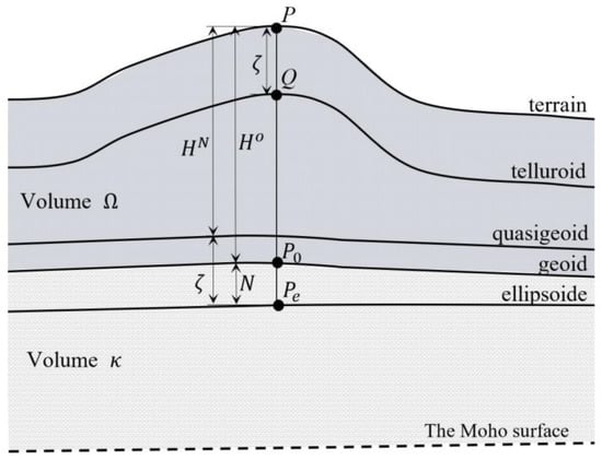 - The potential produced by the mass anomalies located between the geoid and the Moho surface, which are included in Volume . Volume horizontally covers the same area as Volume .