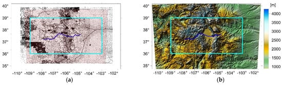 The analyses were conducted in the Colorado geoid computation experiment area []. This area is a highly mountainous area, with an average height of over 2200 ; the highest point is more than 4000 . The basic dataset used in the calculations was provided by the US National Geodetic Survey and consists of the terrestrial gravity data and DEM. To define Volume , the CRUST1.0 Moho depth model ([]) was used. In detail, we used the following datasets: