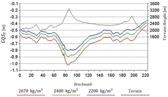 The results presented in Table 1 clearly show that the changes in the density of topographic masses actually have little influence on the height anomalies determined from the GGI model. The individual statistics of the values for all versions are very similar or the same. This is not the case for the GQS values, which differ significantly between different versions of the model. The absolute values of all statistics increase with increasing density, and the increase rate is almost constant. The mean GQS value changes by about for every of change in the density, and the difference between the minimum values for the extreme analysed densities reaches .