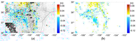 The differences between the determined and reference GQS values: (a) the values; (b) the values. The small black dots in Panel (a) represent terrestrial gravity points.