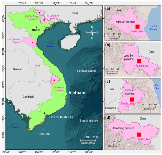 Four datasets (a) DEM 20 m and 30 m in Nghe An Province; (b) DEM 5 m in Lang Son Province; (c) DEM 10 m in Kon Tum Province; (d) DEM 5 m in Cao Bang Province.