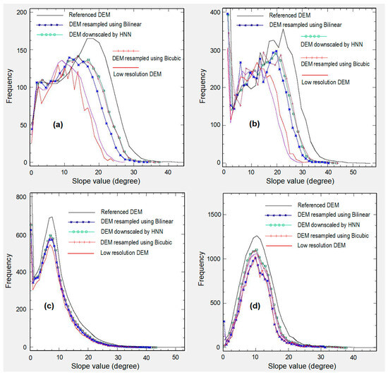 Comparisons of slopes generated from resampled and downscaled DEMs showed that resampling and downscaling could improve the accuracy of slopes. Due to the smoothing effect, the slopes calculated from DEMs at low resolutions are always lower in comparison with those calculated from higher-resolution DEMs [15]. This trend is evident in the histograms of slopes obtained from referenced DEMs, original DEMs, and resampled DEMs using various methods, as shown in Figure 3. Applying the resampling methods to increase the resolution of DEMs, the number of points with higher slopes increased and approached those observed in the referenced DEMs as a result.
