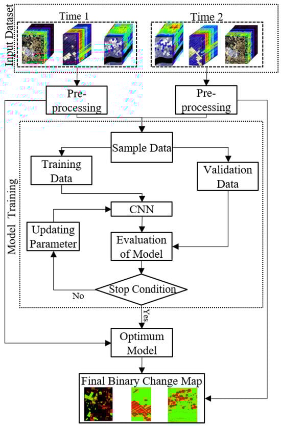 This research proposes a novel double-stream HCD framework using a CNN network, as illustrated in Figure 2, which details the architecture of our dual-stream CNN framework for HCD. To improve efficiency, the two input patch datasets are merged into a single patch dataset through image differencing, a departure from many DL-based frameworks that stack input patch data, thereby reducing computation time and processing.