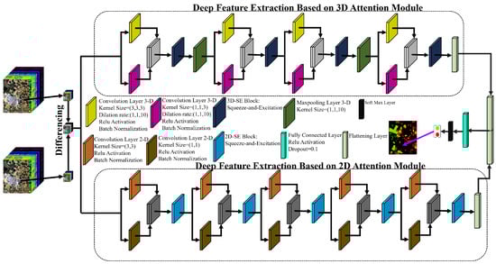 HCD-Net’s architecture combines 3D and 2D convolutional layers and SE blocks to effectively extract and analyze the complex spectral–spatial relationships in hyperspectral data, while keeping computational efficiency in mind. The first stream uses multi-scale 3D convolution blocks, pooling layers, and 3D-SE blocks to explore the spectral–spatial dimensions, capturing the detailed relationships across the various bands of hyperspectral images. This approach enables a thorough analysis, utilizing the full spectrum of spectral information to effectively detect subtle environmental changes.