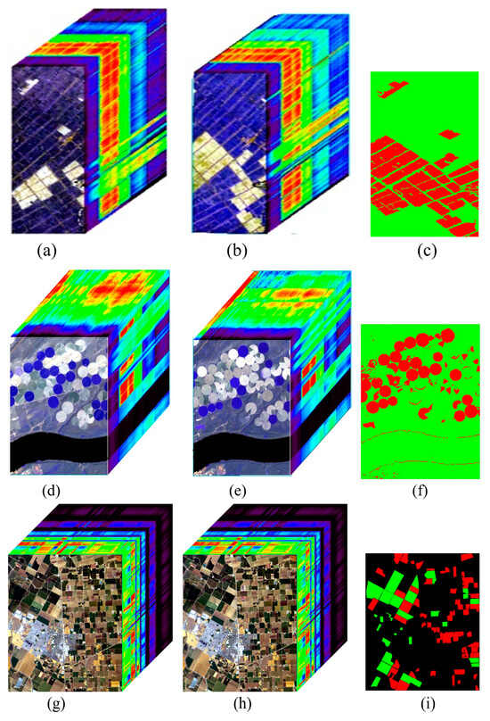(a,b) show composite images of the original HSI collected from the China dataset in 2006 and 2007, respectively, and (c) presents a ground truth image in binary format for these datasets. (d,e) show false-color composites of the original hyperspectral images from the USA dataset, acquired in 2004 and 2007, respectively, and (f) is the ground control data in binary format. (g,h) display hyperspectral images captured from the Bay Area dataset in 2013 and 2015, respectively, and (i) presents the ground truth data.