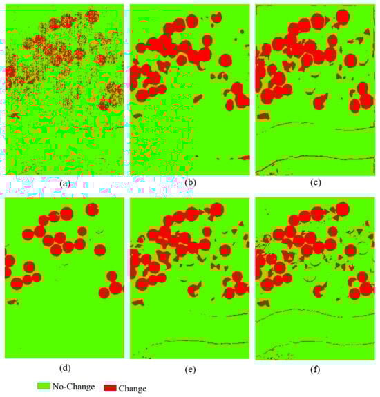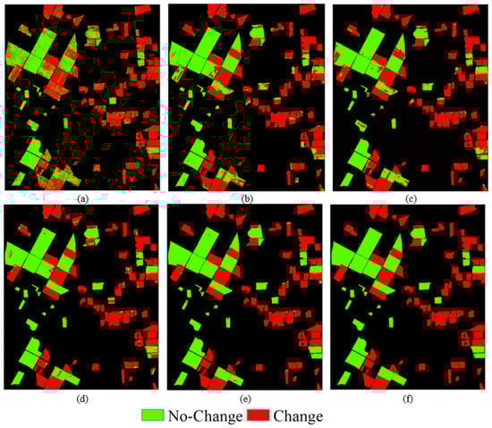The result of the binary HCD for the USA dataset. (a) IR-MAD SVM, (b) 2D-Siamese, (c) 3D-Siamese, (d) GETNET, (e) HCD-Net, and (f) Binary Ground Control.