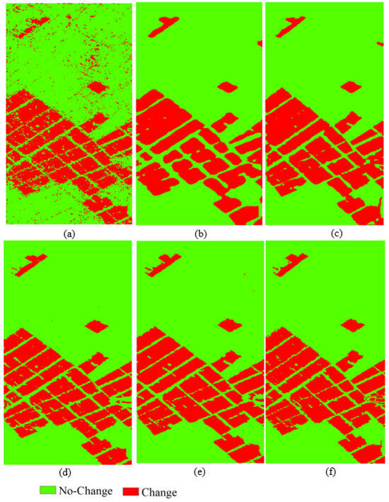 The result of the binary HCD for the China dataset. (a) IR-MAD SVM, (b) 2D-Siamese, (c) 3D-Siamese, (d) GETNET, (e) HCD-Net, and (f) Binary Ground Control.