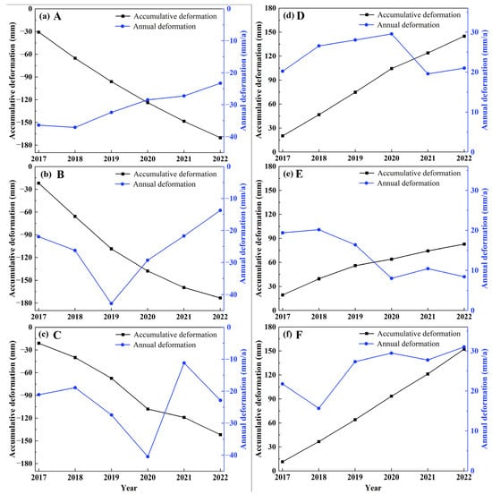 3.1. Spatiotemporal Variations of Land Deformation and the Identified Subsidence and Uplift Areas