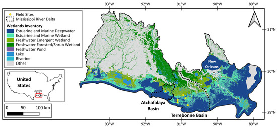 The study area is the coastal wetlands located in the southern region of Louisiana. This area encompasses the Watershed Boundary regions designated by the United States Geological Survey (USGS) at Level-4 classification. Specifically, our research encompasses the hydrologic units spanning the lower Mississippi River and the coastal areas of Louisiana. By targeting these particular regions, we aim to provide a comprehensive analysis of the ecological dynamics and hydrological processes within the coastal wetlands of this unique and critical environment. This region contains the Mississippi River Delta (MRD) and Western Louisiana Delta (WLD). During the 1940s, a river diversion was implemented to control channel flow to Morgan City, reducing the risk of flooding. In 1973, the WLD became subaerial as a result of a river diversion implemented in 1941. In addition to receiving about 30% of the water discharge from the Mississippi River, the Atchafalaya River outlet accounts for 10% of its flow [52]. WLD morphology is influenced by a constant supply of sediment, floods caused by rivers, hurricanes, and cold fronts, and biological processes like organic matter production. In coastal deltaic floodplains, like WLD, tidal freshwater wetland species are grouped according to the elevations of the marsh, which range from subtidal to supratidal in hydrogeomorphic zones. As a natural observatory for assessing hypotheses about coastal deltaic wetlands and their trajectory and sustainability as an adaptation strategy to relative sea level rise, WLD has a number of geomorphic characteristics. An overview of the study area region is illustrated in Figure 1. This area includes the southern coastal wetlands of Louisiana, and the U.S. wetland inventory by U.S. Fish and Wildlife Service is shown, along with Atchafalaya and Terrebonne basins and field data sampling sites.