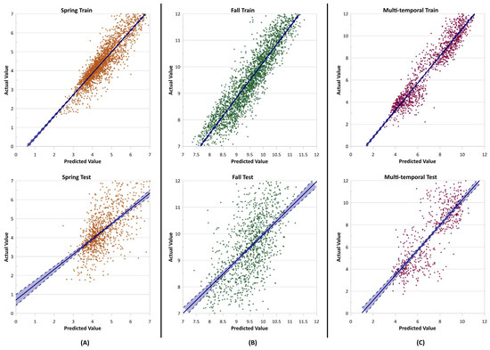 Scatter plot of the predicted and actual AGB (Mg ha−1) values for: (A) spring, (B) fall, and (C) multi-temporal models. Fitted lines with 95% interval indicators are shown in blue lines.