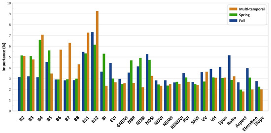 The estimated AGB was evaluated using the 30% untouched test data, separately for the spring, fall, and multi-temporal models. Figure 4 illustrates this assessment through a scatter plot, demonstrating the strong agreement and integrity between the observed and predicted AGB values. Additionally, a fitted line with 95% intervals is depicted in the figure, indicating confidence in the predictions. To further quantify the performance of the regression models, two metrics were employed: RMSE and R-squared. Table 2 shows the evaluation metrics of the models. For the spring model, the RMSE was determined to be 0.97 Mg ha−1, indicating a relatively small average deviation between the predicted and observed AGB values. The corresponding R-squared value was 0.45, suggesting that the model explains 45% of the variance in the observed data. Similarly, for the fall model, the RMSE was 0.98 Mg ha−1, with an R-squared value of 0.36. As for the multi-temporal model, the RMSE was 1.6 Mg ha−1, while the R-squared value was 0.65. Interpreting the RMSE values, lower values indicate higher accuracy and better agreement between the predicted and observed AGB values. The R-squared values indicate the extent to which the model captures the variability in the observed data, with values closer to 1 indicating a stronger relationship. Therefore, the evaluation results suggest that the multi-temporal model performed relatively better, with higher R-squared and slightly higher RMSE values compared to the spring and fall models. The out-of-the-bag (OOB) error is a valuable metric used in ensemble learning methods such as RF. It quantifies the prediction accuracy of the model by measuring the error rate on the instances that were not used during the training process. The OOB error serves as an internal validation measure, providing an estimate of the model’s performance without the need for additional validation data.