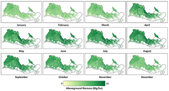 The phenology of AGB in tidal wetlands plays a pivotal role in understanding the temporal dynamics of these ecosystems, as well as their capacity for carbon stock throughout the year. Tidal wetlands, encompassing marshes, mangroves, and seagrass meadows, are highly productive ecosystems that contribute significantly to global carbon storage. AGB phenology in these habitats is governed by complex interactions between hydrological, climatic, and biotic factors, which shape the growth, senescence, and decomposition of plant biomass across different seasons. The monthly results of the AGB derived from multi-temporal model are shown in Figure 8.