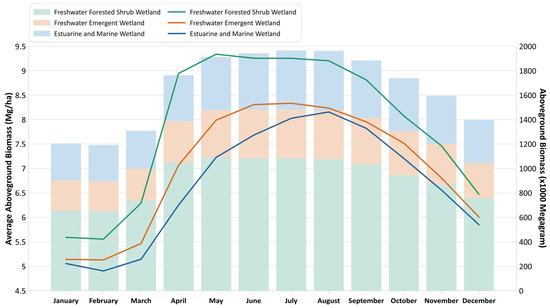 By closely examining the phenology of AGB in tidal wetlands and its association with carbon stock dynamics, researchers can gain valuable insights into the factors that influence the carbon storage capacity of these ecosystems. This understanding is crucial for informing management and conservation strategies aimed at preserving and enhancing the carbon stock potential of tidal wetlands, as well as their role in mitigating climate change and supporting biodiversity. Figure 9 presents an illustration of the mean AGB across various wetland classifications during each month, measured in megagrams per hectare (Mg ha−1). Freshwater forested shrub wetlands exhibited the highest average AGB, and their values exhibited a significant increase during the growing season, peaking at maximum levels between May and August, followed by a gradual decline. The estimated biomass for freshwater forested shrub wetlands accounted for a substantial portion of this region, reaching a maximum of 1,092,480 megagrams. Notably, freshwater emergent wetlands followed a similar temporal pattern to the forested shrub wetlands, with peak averages observed in June and a subsequent decrease beginning in August. Conversely, estuarine and marine wetlands demonstrated the lowest average biomass, exhibiting the most substantial fluctuations in AGB throughout the year. Furthermore, both freshwater forested shrub wetlands and estuarine and marine wetlands contributed a smaller proportion to the overall AGB, measuring 400,746 and 489,972 Mg, respectively.