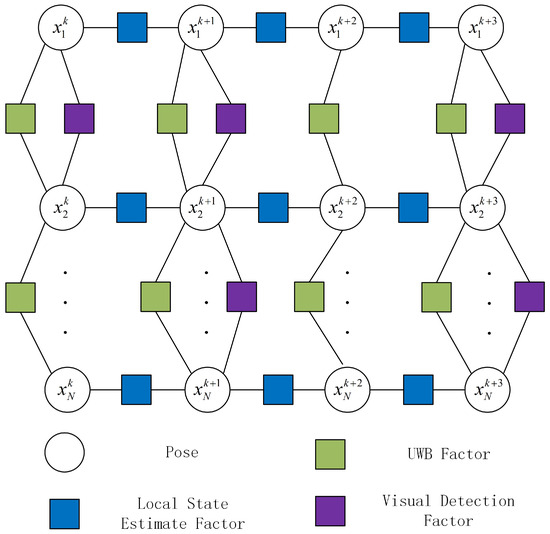 The proposed framework is divided into a front-end and a back-end that run independently on each robot. At the front-end, the raw data are processed separately through local state estimation (LE), visual detection (VD), and UWB modules. On the back-end, state estimation is performed using a graph optimization method. We use sliding windows to construct cost functions based on the measurements of LE, VD, and UWB at each new time step. The state of Robot i to be estimated includes the robot’s orientation quaternion and position at time step k. We define the state estimate of Robot i at each time step k as , so the optimized full state vector of Robot i in the sliding window is defined as: