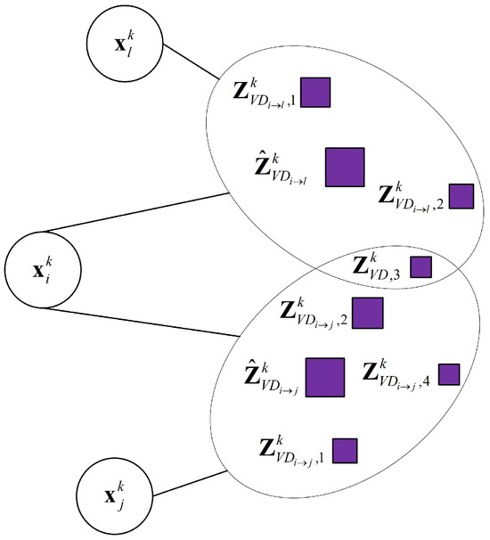 Data association based on visual detection can be understood from Figure 2. When Robot i detects both Robot j and Robot l, there may be multiple object detection bounding boxes or clutter measurements relative to a single target. Therefore, Robot i has multiple relative measurements relative to Robot j or Robot l. In this case, it is necessary to perform data association on these measurements. We use JPDA to enable Robot i to track measurements relative to multiple target robots. Firstly, a validation region is given for these measurements to exclude some invalid measurements. Robot i has four valid measurements relative to Robot j and three valid measurements relative to Robot l. The variables and are the predictions of visual detection measurements of Robot i relative to Robot l and Robot j, respectively. The variables and are the validation measurements in the validation region of Robot i relative to Robot l and Robot j, respectively. In particular, is in the intersection portion of the validation region, indicating that it may come from Robot i relative to Robot l or Robot j. Then, JPDA is used to calculate the probability for each validated measurement. In Figure 2, the size of the rectangle in the validation region represents the probability of measurement. The probabilities of these calculations are used in the above equation. Therefore, only validated relative measurements can contribute to a final solution based on weights.