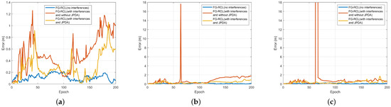 As shown in Figure 4, the localization performance of the system is further verified by the RMSEs of three robots in each case. In Case 3, the RMSE is the highest, and some outliers even deviate significantly from the normal range of values, with the location error of Robot 3 being far more than 18 m at 63–67 epochs. This is because visual detection measurement interference can add false information to the fusion process of the factor graph, which significantly increases the localization error. Although Case 2 has the smallest RMSE and the best execution effect, it cannot reflect the real environment because it does not add any false information to the factor graph. Therefore, it can be seen from the RMSE of Case 4 in Figure 4 that using JPDA to handle visual detection measurement interference is an effective solution for real environments.