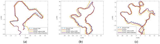 To verify the effectiveness of the proposed sensor fusion method, we constructed different localization scenarios that discarded UWB measurement and visual detection measurement data. Figure 7 shows the ground truths and estimated trajectories of the three robots. It can be seen that the estimated trajectory of the FG-RCL algorithm, which integrates visual detection measurement and UWB measurement, is closest to the ground truth. The estimated trajectories relying only on visual detection measurement are the worst. This is due to the presence of many obstacles in the scene used for the dataset, which resulted in a small number of visual detection measurements being acquired between the robots.