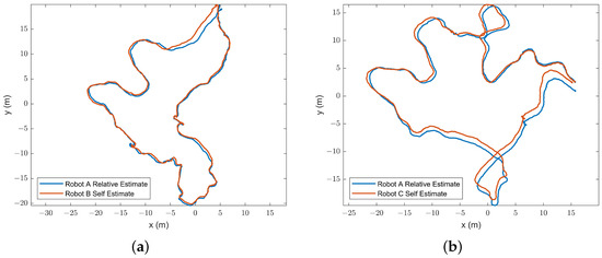 Comparison of relative estimated trajectories. Robot A obtains the states of Robot B and Robot C by relative state estimation and compares them with its own estimated state. (a) Relative estimated trajectories of Robot A&B. (b) Relative estimated trajectories of Robot A&C.