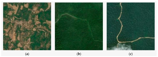 We obtained 200 satellite images for model training, validation, and testing. Images were ‘screenshots’ (i.e., reduced-resolution copies) of high-resolution true-color satellite imagery (~0.5–1 m pixel resolution) observed using the Elvis Elevation and Depth spatial data portal (https://elevation.fsdf.org.au/, accessed on September 2022), which here is functionally equivalent to the more familiar Google Earth. Each of our 200 images were initially acquired at a resolution of 1920 × 886 pixels. Actual image resolution was coarser than the native high-resolution imagery, at 5 m, but still appreciable (Figure 2 and Figure 3a–c). These images are freely available online [45]. The images generally spanned either forest–agricultural mosaics (Figure 3a) or intact forest landscapes with limited human intervention (Figure 3b,c). The 200 images were in PNG file format and ultimately parsed into their constituent red, blue, and green (RBG) channels for model training and road classification.