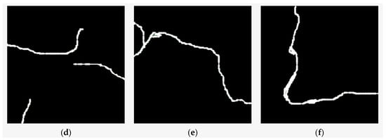 The 200 satellite images (Figure 3a–c) and corresponding road-reference images (Figure 3d–f) were then subdivided into thousands of smaller image ‘tiles’ of 256 × 256 pixels each. The resultant number of input tiles was subsequently increased using data augmentation procedures [46] meant to enhance the informational basis of neural network training, much as for supervised learning generally. Data argumentation [46] entails a variety of operations applied to image data to produce new, complementary image data, e.g., image rotation, color adjustment. In this work, image rotation was employed, resulting in a total of 8904 image tiles. Of these 8904 image tiles, we randomly selected 80% for model training (during which a model ‘learns’ to recognize road features in the input imagery), 10% for model validation (during which model parameters are iteratively refined), and 10% for final model testing (during which the final accuracy of the output road map is assessed). By randomizing the selection of image tiles, we increased the diversity of data used during training, validation, and testing, a factor found to enhance model accuracy more than the nominal quantity of input data [36]. Sloan et al. [45] provide these 8904 image tiles as true-color images and corresponding road-reference images, allowing for further model development by others.