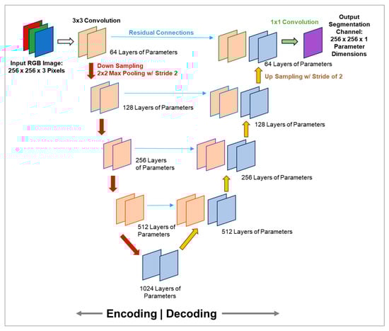 The decoding phase of the UNet architecture similarly consists of four discrete modules, each housing two 3 × 3 convolutional layers preceded by ReLU activation. Distinct from the encoding stage, the decoding phase incorporates distinct operations before and after each module. In particular, the input of each decoding module is concatenated with the output stemming from the subsequent encoding module. This intermodular concatenation integrates the input module’s 512 feature channels with the output of the corresponding encoding module, yielding an identical count of 512 layers. A pivotal operation in the decoding phase is the application of a 2 × 2 transposed convolution operation, synonymous with a deconvolutional or up-convolutional layer. This operation reduces the feature map quantity by half while concurrently doubling the dimensional extent of individual feature maps. Our UNet model attempts to skirt issues of small dataset and low accuracy more common to fully convolutional network models [48] by adding skip connections between the down-sampling and the up-sampling phases (Figure 4). The skip connections transferred information from the feature extraction layers to the up-sampling layers by concatenating data in the encoding phase to data in the decoding phase at the same level.