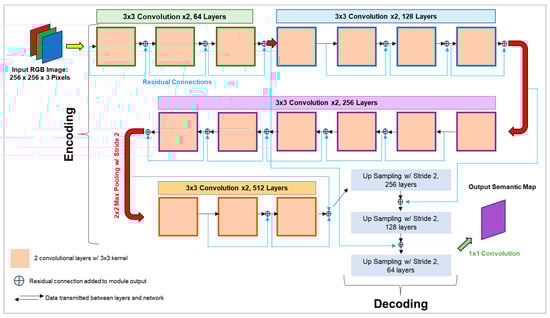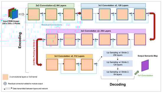 The ResNet-34 architecture, initially designed for image classification, was modified here to enable semantic segmentation. In the original ResNet-34 architecture, fully connected layers were used in the output, which cannot be used here for pixel-wise classification of the Road vs. Not Road classes. Instead, fully connected layers our ResNet-34 model were replaced with three consecutive up-sampling layers with a stride of 2, i.e., deconvolutions, to resize the output to the original size of the image (blue boxes in Figure 5). Each of these up-sampling layers were smoothly integrated with a 2 × 2 transpose convolution operation. This process was used to simplify the output feature map while maintaining its original dimensions. The model’s focus is on binary classification, again Road vs. Not Road, evaluated at each pixel.
