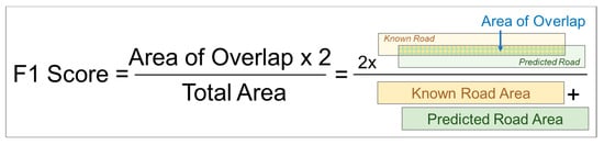 Figure 9 reports road-mapping accuracy amongst of our three models according to the F1 score and mIoU metrics (Equations (2) and (6)). These metrics’ values are middling but indicative of accurate road detection.