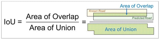 The mean intersection over union (mIoU) metric describes the degree to which image features classified as Road spatially overlap actual roads in the reference data but not areas known to be Not Roads in the same reference data. Given our Road target class, the mIoU metric is given formally as the ratio of, on the one hand, the area of overlap of predicted and known Road pixels and, on the other, the combined area of predicted and known Road pixels, averaged over all N image tiles (Figure 8, Equation (5)) [29]. This metric is similar to the F1 score in that it accounts for the imbalanced nature of the reference data. The mIoU metric has a theoretical minima and maxima of 0 and 1, where 1 indicates an exact duplication of the road features in the reference dataset. Equation (5) may be simplified as Equation (6).