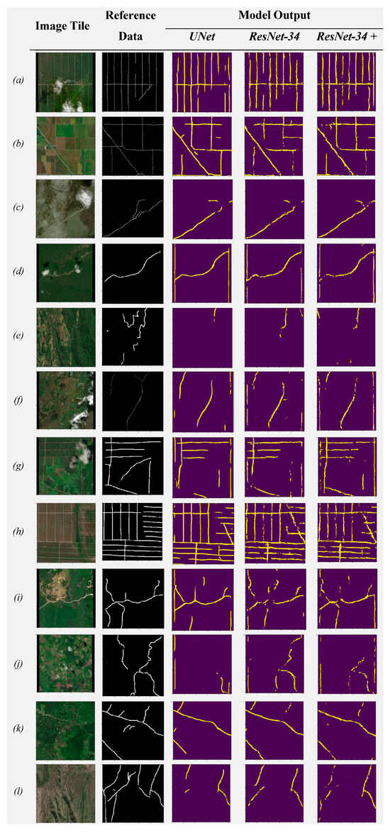 The ResNet-34 architecture was preferred over more complex, ‘deeper’ variations, such as the ResNet-110 architecture with 110 layers, because of its greater balance of computational efficiency and model accuracy. Efficiency is potentially an important factor for any scientific open-access and/or online ML road-detection initiative realized at regional to continental scales. Our findings, based on ResNet-34 as well as UNet, therefore represent a baseline against which more complex models prioritizing accuracy over efficiency may be considered.