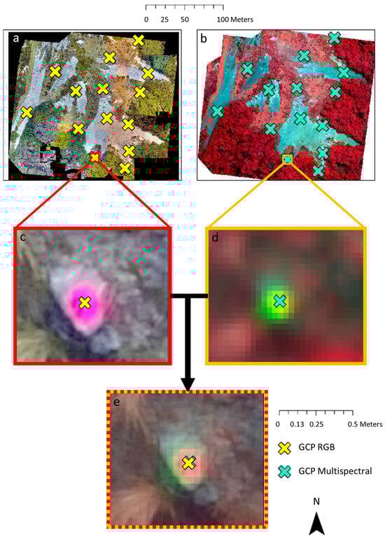 Accuracy assessment (in terms of Root Mean Square Error, RMSE) of RGB vs. multispectral imagery for the Craigieburn site, New Zealand, by manually selecting GCP centres in ArcGIS Pro. Images (a,c) show the RGB imagery, while (b,d) depict the multispectral imagery with marked GCPs. Image (e) presents an overlay of both spectral layers, enabling the measurement of spatial displacement. The mean offset across all 14 GCP’s between RGB and multispectral imagery was 5.29 ± 2.34 cm.