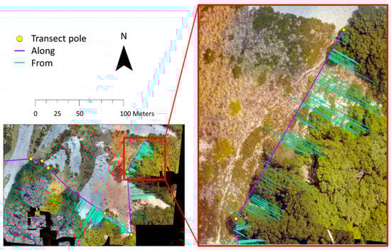 The initial establishment of monitoring transects for treeline seedlings occurred in the austral summer of 1990–1991 [], with three subsequent re-measurements occurring thereafter. These transects, set parallel to the treeline edge along a predetermined compass bearing, provide detailed data on each seedling’s location, height, diameter and tree tag number. Every seedling within a 20 m distance beyond the treeline edge was included in the transect. The recorded locations were based on measurements taken both “along” and “from” the transect line. Within this study, these transects were re-sampled in 2018–2019. To accurately map seedling positions in the field, the poles marking the transects were georeferenced with centimetre-level precision (Figure 5) using the same differential GPS system employed for the vegetation survey. With the coordinates of the start and end points of the transect, as well as the bearing of the transect line, we were able to spatially calculate the relative location of the seedlings (“along” and “from” measurements) in a GIS, and convert them to the New Zealand Transverse Mercator coordinate system. In ArcGIS Pro, an “offset” function was used to accurately place each seedling in the GIS, based on its “from transect” distance, at a 90° angle to the main transect bearing (Figure 5).