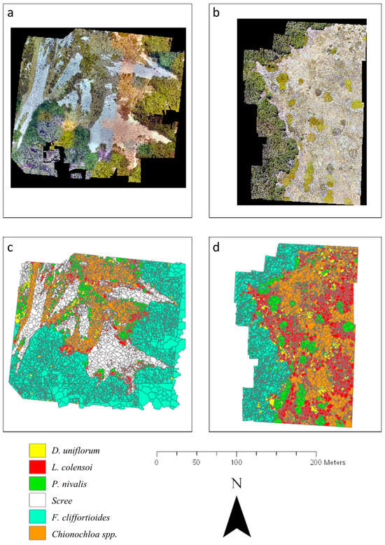 Results of the vegetation classification for both subalpine treeline ecotones. The figure presents RGB images of (a) Craigieburn and (b) Mt Faust (2 cm resolution), as well as vegetation classification via seven spectral reflectance bands of (c) Craigieburn and (d) Mt Faust (5 cm resolution). Bare ground, unvegetated ground (scree), mountain beech (Fuscospora cliffortioides) and tussock grasses (Chionochloa spp.), and three types of alpine shrubs (Dracophyllum uniflorum, Leucopogon colensoi, Podocarpus nivalis) are clearly distinguished. At Mt Faust, scree areas were lacking.