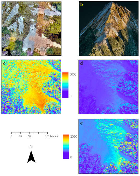 An RGB image and a point cloud generated from LiDAR data for the Craigieburn site, New Zealand. The image shows (a) an RGB image (2 cm resolution), (b) a vegetation height model (20 cm resolution), and (c) a highlighted vegetation height model for a selected area within the site. The vegetation height data for both topographic features and vegetation are obtained by computing the difference between the DTM and the DSM.