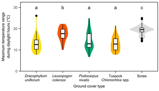 Box-and-violin plots of the maximum surface temperature range during daylight hours (late autumn) by ground cover type. Maximum differences in surface temperature were derived from UAV-based thermal imaging surveys in the morning and at noon on east-facing slopes of Craigieburn site, New Zealand. Different lower-case letters indicate statistically significant differences at α = 0.05 (post hoc test based on Tukey contrasts).