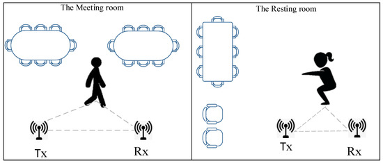 Due to the ubiquity of WiFi signals, CSI-based activity recognition utilizes only the wireless communication function and does not require any physical sensors, which provides a great improvement in the security and protection performance of privacy. CSI-based activity-recognition schemes are often composed of four steps, i.e., data processing, activity classification, feature extraction, and activity detection [12,18]. The corresponding works use primitive signal features, which carry much information caused by human activity and the environment changing with different layouts. At the same time, the CSI extracted by the antenna array is affected by environmental changes, which results in different impacts on the wireless link by human behavior in different scenarios, shown in Figure 1, where two people are performing walking and squatting in two different rooms. It is called the cross-scene problem. The cross-scene problem refers to the ability of the model to generalize across different environments or scenarios and to handle the transition from one scenario to another, which also means that the system needs to be adaptable to recognize activities in multiple scenarios. The multipath channel caused by a specific activity varies with changing environment deployment in different scenes [19,20]. Current works have applied machine learning to solve this problem [21,22,23,24]. A hybrid image dataset (ADORESet) has been proposed, which combines real and synthetic images to improve object recognition in robotics, bridging the gap between real and simulation environments [25]. The possibility of connecting object visual recognition with physical attributes such as weight and center of gravity has been explored to improve object manipulation performance via deep neural networks [26]. However, much of this work relies on many training samples to improve accuracy, which is unrealistic when collecting data in reality. The experimental environments are all single scenes, which cannot verify the generalization ability of the models. Therefore, more flexible methods need to be developed for CSI-based human activity recognition with small samples and across scenes.