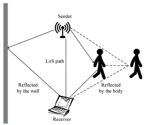 where denotes the dynamic pathways, represents the total CFR of the static paths, and is the carrier frequency offset (CFO). Preprocessing can be used to filter out the high-frequency components in static response, as the CFR power fluctuates mostly due to human activity. Because of multipath effects, the value of CFR fluctuates with dynamic components, which may be used to detect human activity. Based on the Friis free space propagation equation [29], as illustrated in Figure 3, the power of receiver is defined as: