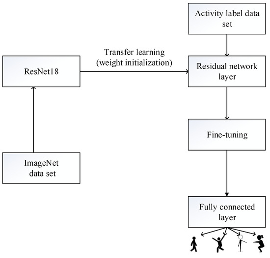 One common deep learning technique that is frequently applied to tiny training samples is transfer learning. To accomplish the migration, model-based transfer learning is used [34], which looks for pretrained parameter weights that the network’s bottom layer may share. After obtaining the pretrained model with the ImageNet dataset, we replace the random initialization model parameters with the new parameters except for the last fully connected layer. Since each CNN in the ImageNet dataset is trained using 1000 classes, and our activities include four classes, fine-tuning is used to make sure that the network weights will not change too quickly and will fit our data without altering the original model. Therefore, a small learning rate is set to avoid gradient vanishing.